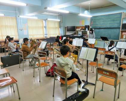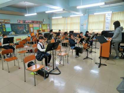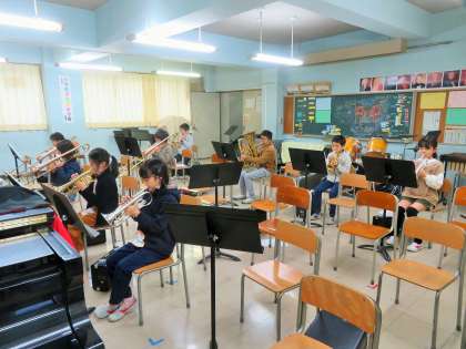 金管バンドの朝練習は、感染症拡大予防対策として学年毎やクラス毎に分けて取り組んでいます。今日は4年生の練習日で、「金管バンドコンサート&お別れ会」(保護者の皆様向け)に向けて「崖の上のポニョ」を練習していました。