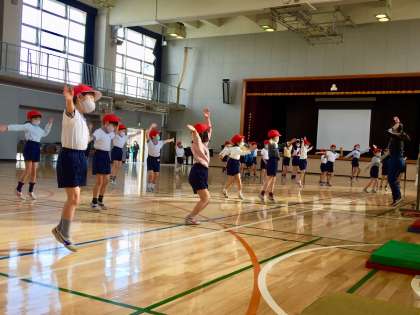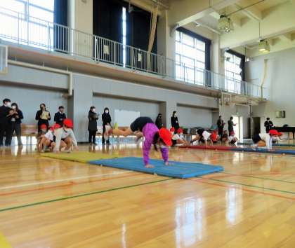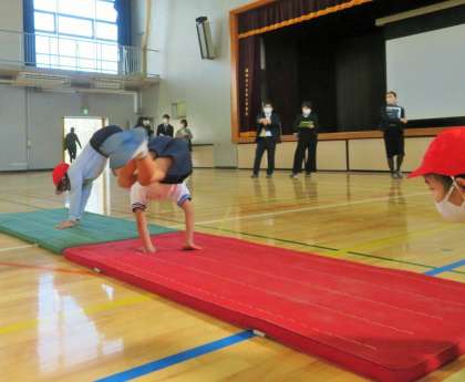 先日は、1年生の岩崎教諭が指導する「マットを使った運動遊び」の授業について、日本体育大学教授の白旗和也先生を講師にお招きし、研究授業を行いました。