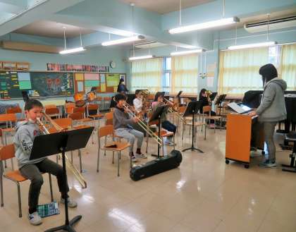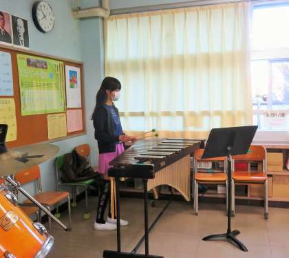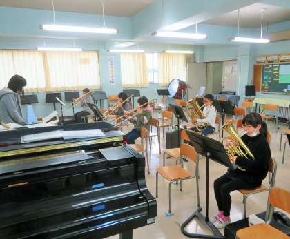 金管バンドの朝練習は、感染症拡大予防対策として学年毎やクラス毎に分けて取り組んでいます。今日は4年生の練習日で、「金管バンドコンサート&お別れ会」(保護者の皆様向け)に向けて「崖の上のポニョ」を練習していました。