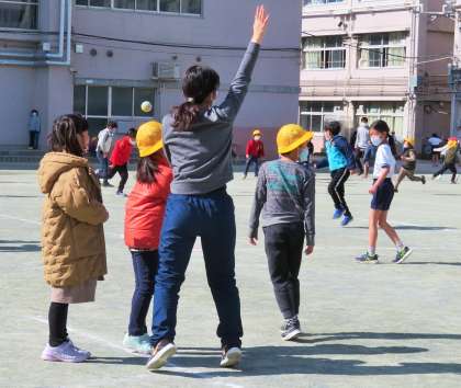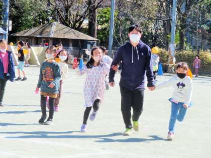 休み時間の校庭には、先生と子どもとの共遊びの姿が多く見られます。私は、外遊びが「体力づくりの原点」と考えています。また、私自身の経験からも先生と一緒に遊んだ思い出は一生忘れません。