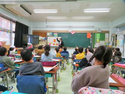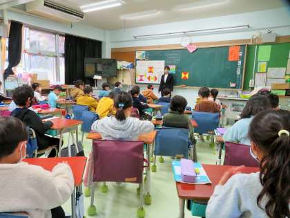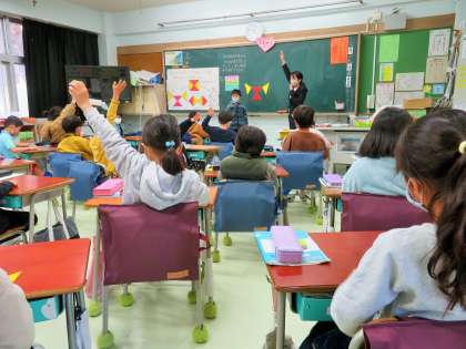 先日は1年生の岩崎教諭が、算数の研究授業を行いました。算数の「かたちづくり」という単元で、はじめのかたちから、3つのほうほうをつかって、いろいろなかたちをつくろうというねらいをもっての学習です。