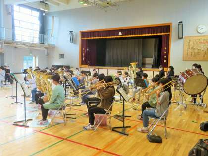 金管バンドの朝練習は、感染症予防対策を徹底しながら取り組んでいます。現在は、「金管バンドコンサート&お別れ会」(保護者の皆様向け)に向けて、発表隊形に近い隊形で練習をしています。