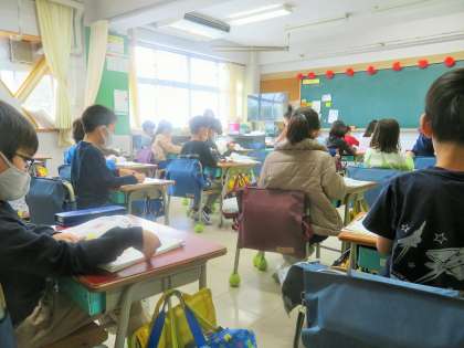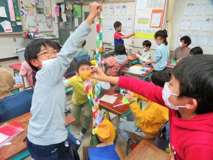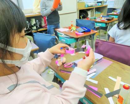 授業の様子をお届けします。新1年生を迎えるために「輪飾り」を作っています。