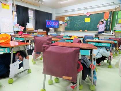 今日の避難訓練は、子どもたちには「予告なし」で行いました。昼休み後に大きな地震という設定で行いました。サイレンの音とともに、ほとんどの子どもが瞬時に反応し、指示をよく聞いていました。しかし、一部の子どもたちにおしゃべりがありましたので、私は「不合格です」と話しました。一人の命も失ってはいけません。今後とも避難訓練には厳しく臨みます。