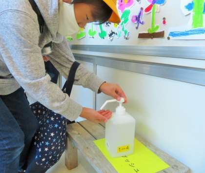 感染症の予防対策として、教室に入る際には、アルコール消毒をして「健康観察カード」の提出を徹底しています。