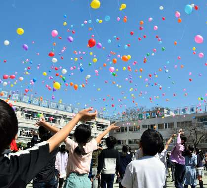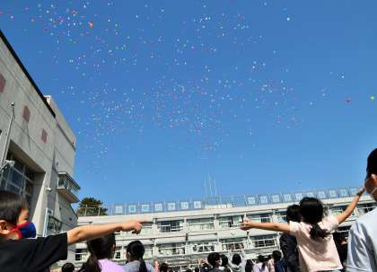 お陰様で、子どもたちの心にいつまでも残る周年イベントとなりました。最後まで見届けていた業者の方が「これだけの大規模校(児童数)で、よい天気の中、これだけきれいに上がった風船は初めて見ました!」と話していました。