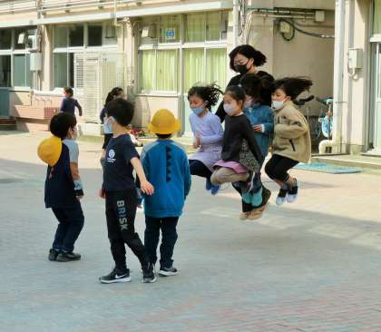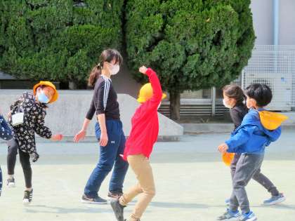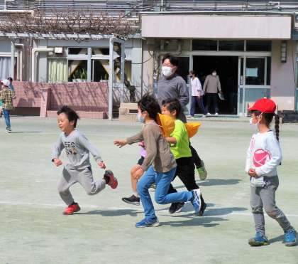 松丘小学校の休み時間は、校庭いっぱいに広がって遊ぶ子どもたちの笑顔ではちきれそうです。中でも、子どもたちと一緒に先生たちも遊んでいると、いっそう笑顔が膨らみます!