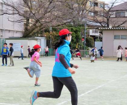 担任の先生も紅白帽をかぶって鬼ごっこです。紅白帽をかぶるだけでも子どもたちは大喜びです!
