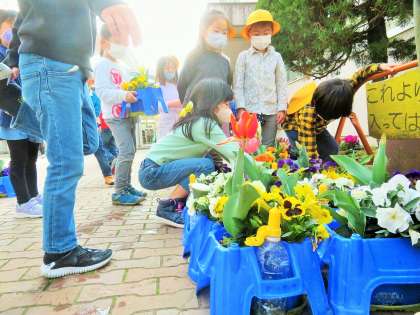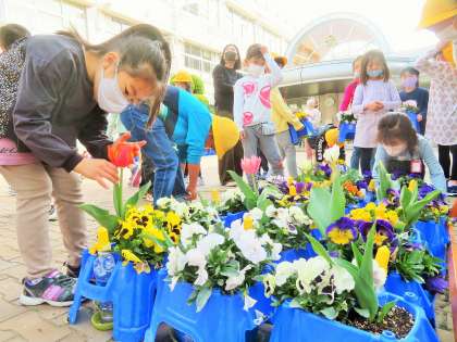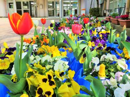 1年生は、11月中旬に植えたチューリップの球根とパンジーの苗を育ててきました。鉢を正門に移動させ、卒業式や入学式が、お花でいっぱいになるようにしました。