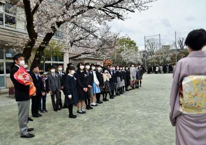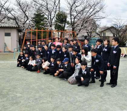 校庭でもクラス毎に集まり、保護者の皆様とともに卒業生の門出を祝っています。