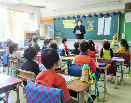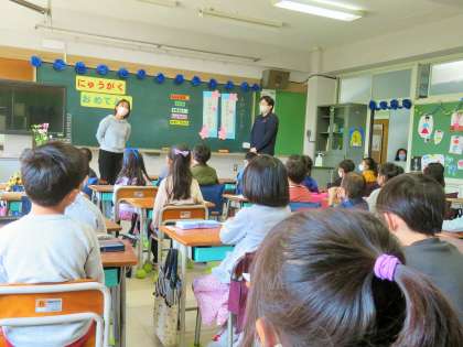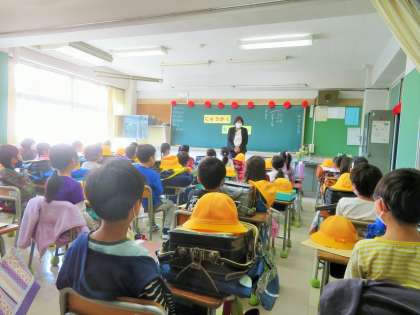 1年生の教室は・・・?とそれぞれの教室に入りました。落ち着いて、姿勢正しく先生の話を聞いている子どもたちに感激です。