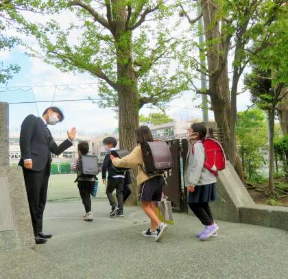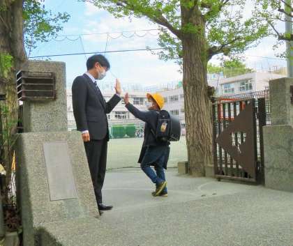 毎朝、正門や南門に立って子どもたちをお迎えしていると、気持ちのよいあいさつをはじめ、「いつもありがとうございます!」、「休み時間に遊んでください!」など、様々な会話がありお互いが笑顔になります。朝のひと時ですが、とっても楽しい時間なのです!