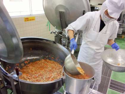みなさんに「おいしい」といってもらえるように、調理員さんと一緒に給食作りをがんばります。