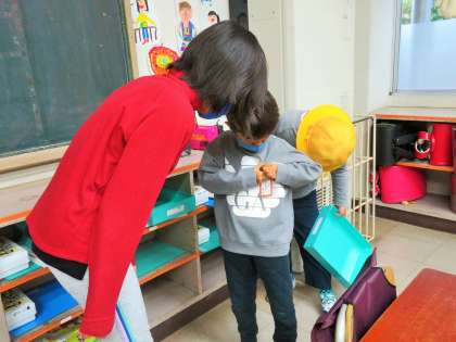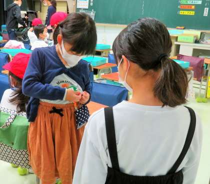 1年生が登校して来ると、6年生のサポーターが明るくお迎えをしています。1年生が自分でやろうとする気持ちを大切に、絶妙なタイミングでサポートをしています。何でも手伝ってしまうのではなく、1年生が自分でできることを増やそうとしている6年生の姿に感心します!