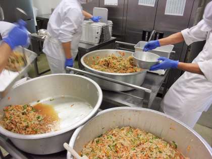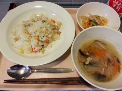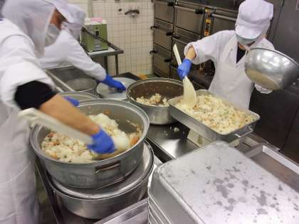 給食のチャーハンは、炊きあがったごはんと炒めた具材を混ぜて作ります。