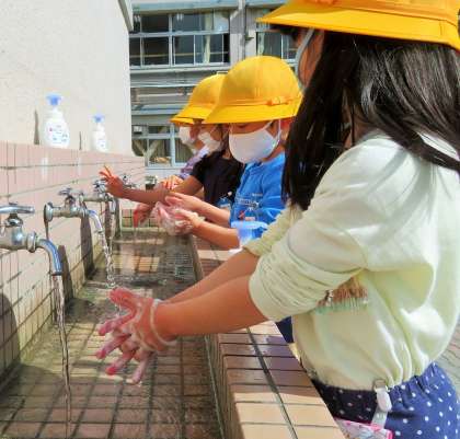 遊んだ後は、石鹸での丁寧な手洗いと、アルコール消毒です。
