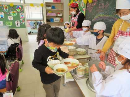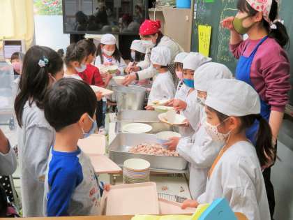 今週からは担任の指導のもと、子どもたちによる給食当番が続いています。白衣やマスクを着用し、手洗いと消毒をしてから役割分担をして、手際よく配膳と盛り付けを行っていました。