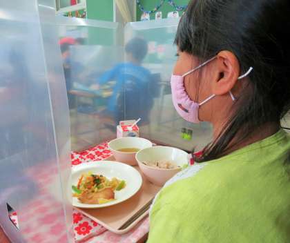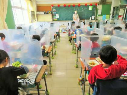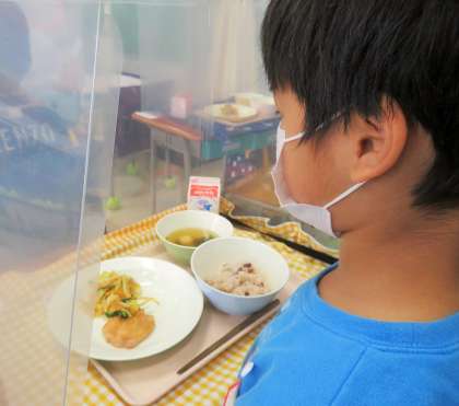 手と手を合わせて「いただきます!」をしてからマスクを外します。不憫ではありますが、極力お喋りをなくして給食をいただきます。