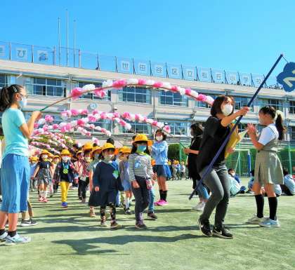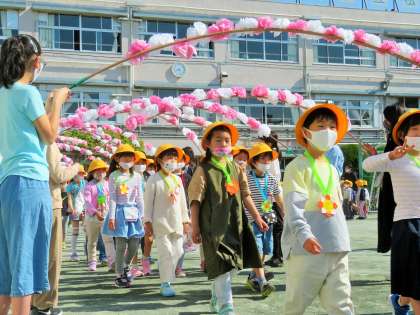今日は、待ちに待った「1年生を迎える会」を校庭で行いました。まずは1年生が入場です。