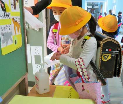 感染症の予防対策として、教室に入る際には、アルコール消毒、「健康観察カード」の提出を徹底しています。