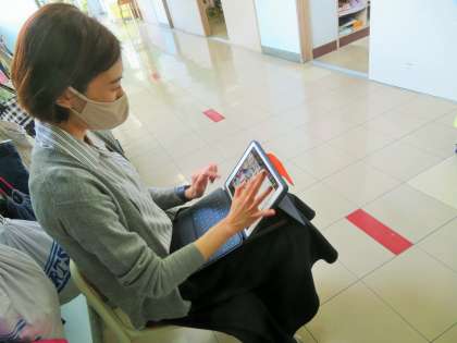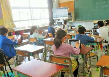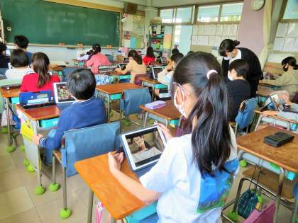 本日もiPadを使って、Zoomの使い方を確認しました。担任の先生は廊下からZoomを使って、2つの教室に分かれている子どもたちに配信という形態で実施しました。