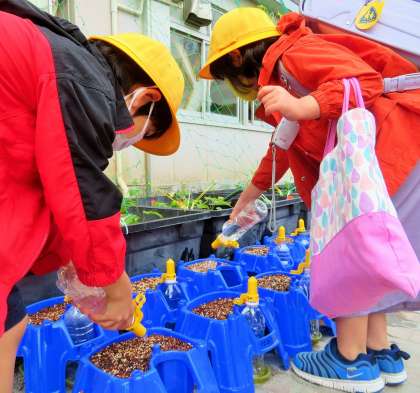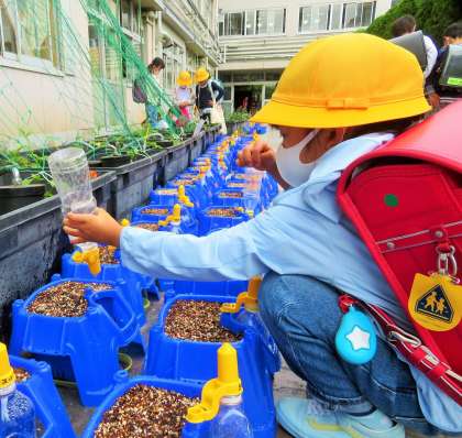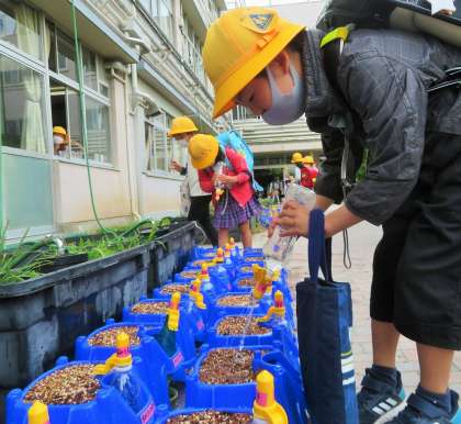 1年生は、登校時にアサガオの水やりをしています。水やりのタイミングは、朝のうちがベストです。朝から、日が高くなるまでのあいだ、比較的涼しい時間帯のうちに、水やりを行うのがコツです。「早く芽が出てこないかな!」という1年生のつぶやきが聞こえてきます!