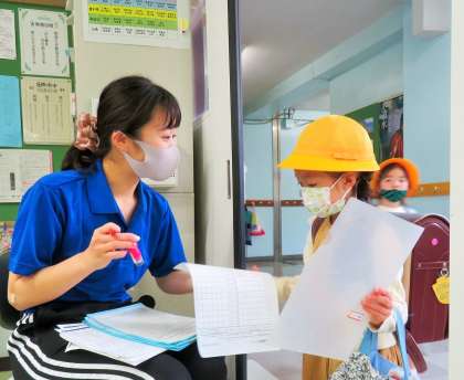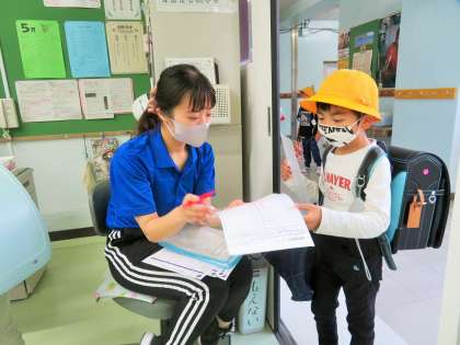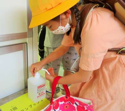 感染症の予防対策として、教室に入る際には、アルコール消毒、「健康観察カード」の提出を徹底しています。