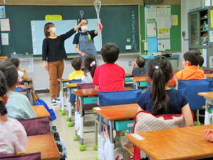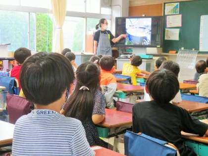 1年生向けに栄養士による授業がありました。子どもたちが「食」について、さらに興味をもつことができるよう、実際に給食室で給食を作っている映像を見せたり調理道具を見せたりしました。給食室の映像はもちろん、調理器具の大きさにも子どもたちは興味津々でした。すでに給食が待ちきれない様子でした。