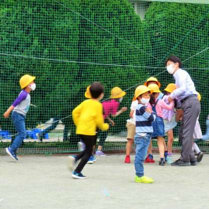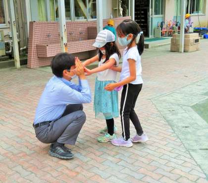 私は「かくれんぼ」の鬼役ですが、2年生が寄り添ってきて鬼ごっこへと誘います。この後は「かくれんぼ鬼ごっこ」へと、遊びが変わってしまいました!
