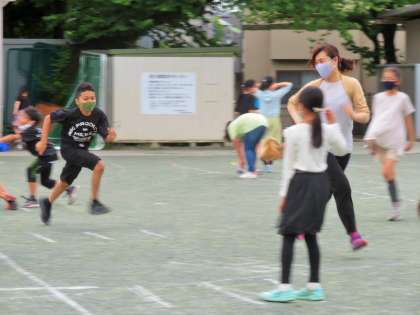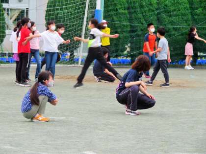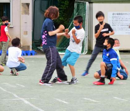 「全員鬼ごっこ」の様子ですが、座って休むこともできる鬼ごっこです。コロナ渦において「マスクを着用」したままでできそうな、よく考えられた鬼ごっこです!
