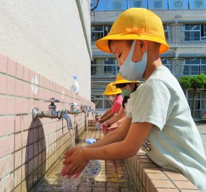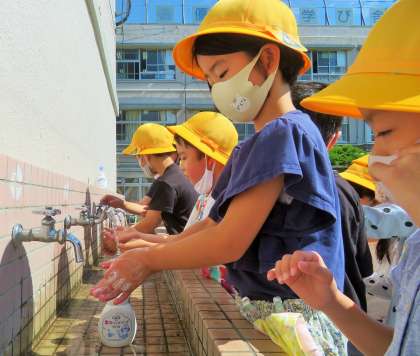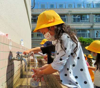 遊んだ後は、石鹸での丁寧な手洗いと、アルコール消毒です。