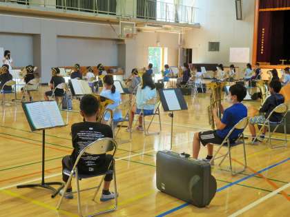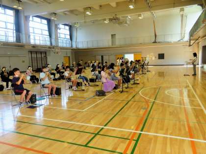 金管バンド朝練習は、感染症拡大予防対策として学年単位で練習をしていますが、本日は特別に体育館で5・6年生合同での練習です。ソーシャルディスタンスを保ちながら取り組んでいます。
