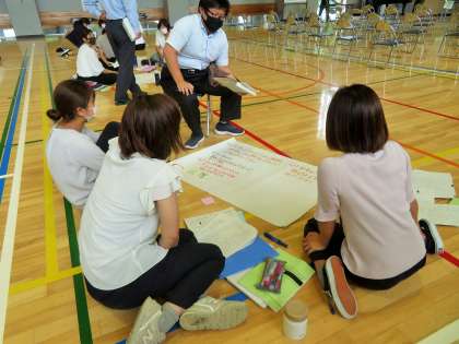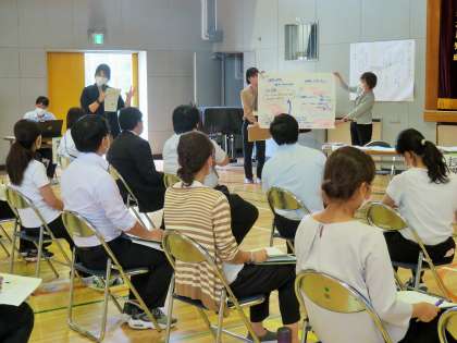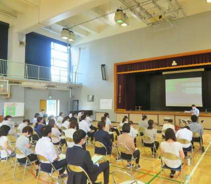 子どもたちの下校後は、実践した授業をもとに協議し、講師の先生からご指導をいただきました。講師の先生からは、「ハードル等の準備が早くて素晴らしい!」「子どもたち一人一人が生き生きと取り組んでいた。」「チームで協力ができていて、学習性が高いですね。」と褒めていただきました。
