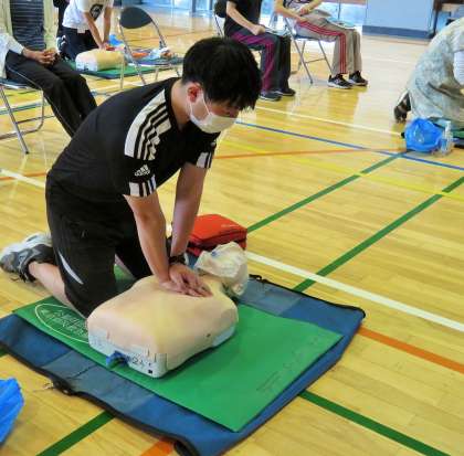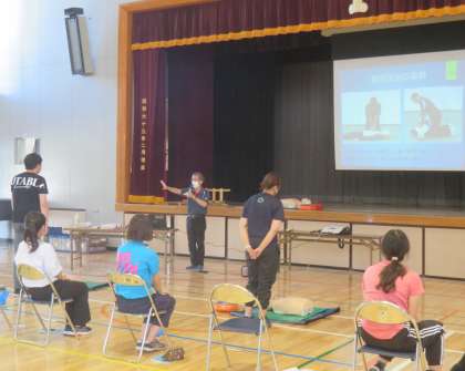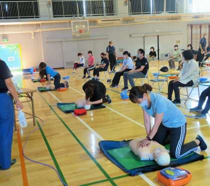 今年度の水泳指導に向けて、救命救急講習会を行いました。消防署の方々に来ていただき、心肺蘇生法、AEDの使い方を中心に、応急手当の方法を、実習を通して学びました。