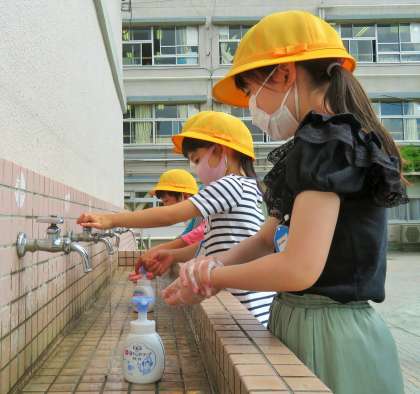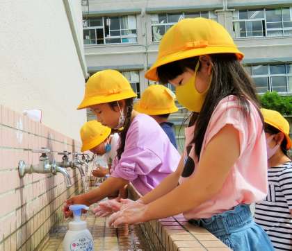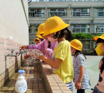 遊んだ後は、石鹸での丁寧な手洗いと、アルコール消毒です。