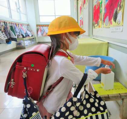 感染症の予防対策として、教室に入る際には、アルコール消毒、「健康観察カード」の提出を徹底しています。