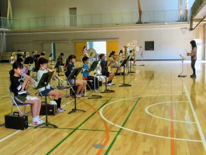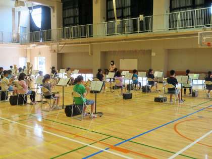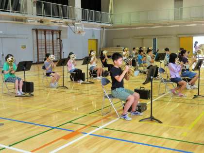 金管バンド朝練習は、感染症拡大予防対策として学年単位で練習をしていますが、本日は特別に体育館で5・6年生合同での練習です。ソーシャルディスタンスを保ちながら取り組んでいます。