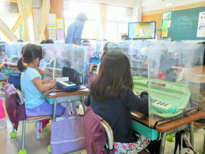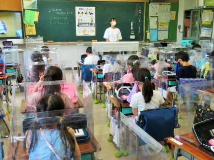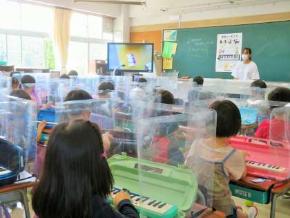 1年生は、鍵盤ハーモニカの練習がはじまりました。みんなで音を合わせて「ドドド・」「レレレ・」・・・。タンギングで音を切って演奏してみました。 感染症予防のためパーテーションを立て、学習マスク(音楽マスク)をして取り組んでいます。