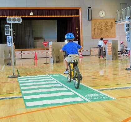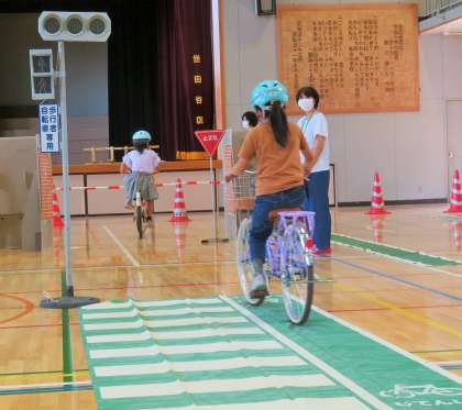 自転車の走行訓練を行いました。多くの子どもたちが、ヘルメットを着用していましたので安心しました。子どもたちの交通事故で、一番多いのは自転車での事故です。安全が第一ですので、ヘルメットの着用を、ぜひお願いいたします。