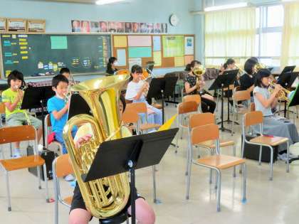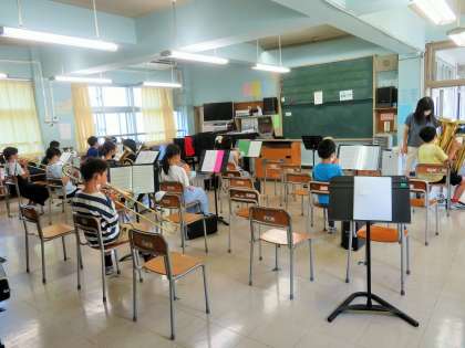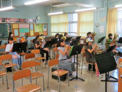 金管バンド朝練習は、感染症拡大予防対策として学年単位で練習をしています。今日は5年生の練習ですが、来週の火曜日からは「4年生の体験入部」がはじまるので張り切って練習をしています。