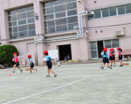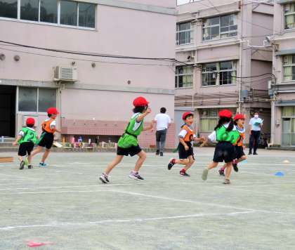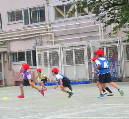 先日は1年生の衣笠教諭が、体育の研究授業を行いました。体育の「鬼遊び」という単元で、チームで作戦を立てて、宝をたくさん取ろうというねらいをもっての学習です。子どもたちは、意欲的に学習に取り組んでいました。