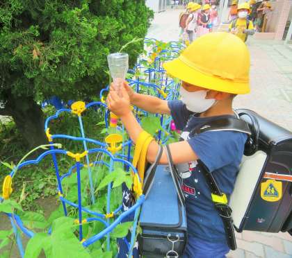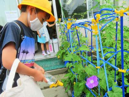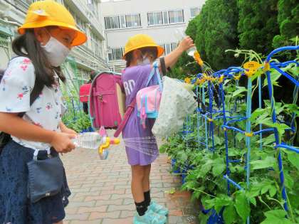 登校後にアサガオの水やりをしている1年生から「校長先生、○○さんの、花が咲いている!」と嬉しそうな声が聞こえてきました。自分のだけでなく、友達のアサガオにも目を向けています。