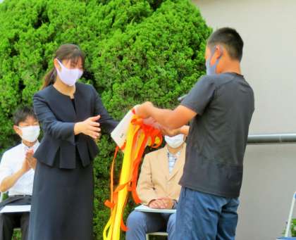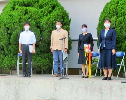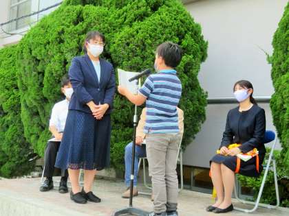 式では、2年生から6年生の子どもたちが、ご出席の3人の先生方に心をこめてお礼をしました。一人一人の先生方に手紙を読む子が、全校を代表して壇上に上がりました。