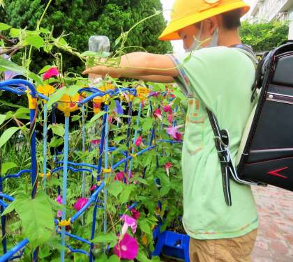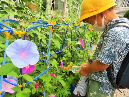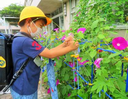 1年生が大切に育てているアサガオは、今日も大輪の花を咲かせています。登校して来た子どもたちの目を楽しませてくれています。1年生の子どもたちは、しっかりとお世話をしています。