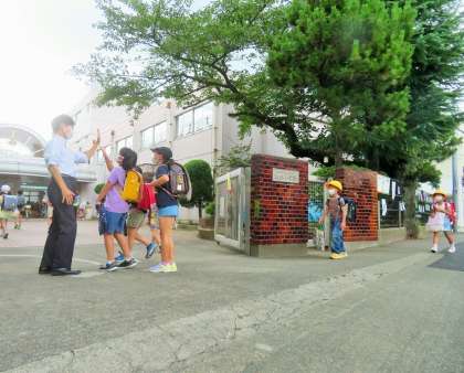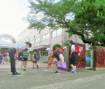 気持ちのよいあいさつをはじめ、エアータッチをする子、立ち止まってきちんとあいさつする子、「夏休みは○○が楽しみです!」と話してくれる子など、様々な会話もありお互いが笑顔になります!