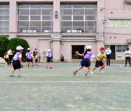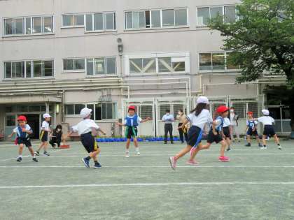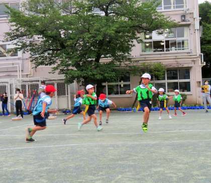 授業のめあては、「チームで作戦を立てて、宝をたくさん取ろう」です。それぞれのチームで「ジグザグ」「おとり」「すきま」などの作戦を立てて宝を取りに走りまわりました。