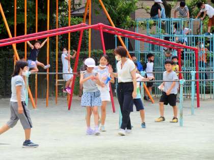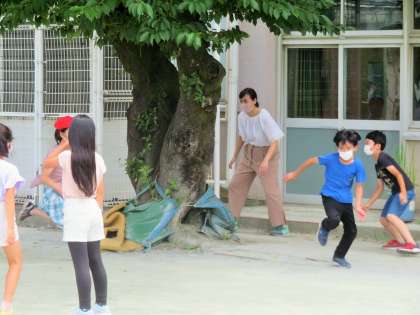 休み時間の校庭には先生と子どもとの「共遊び」の姿が見られ笑顔でいっぱいです。私の経験からも先生と一緒に遊んだ思い出は一生忘れません。先生と子どもが共に汗を流しながら共遊びをしています。