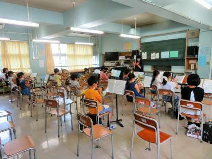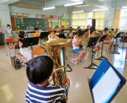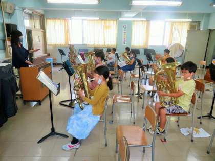 夏季休業中も金管バンド朝練習は、感染症拡大予防対策として学年単位で練習をしています。今日は7時35分から4年生、8時30分から5年生です。