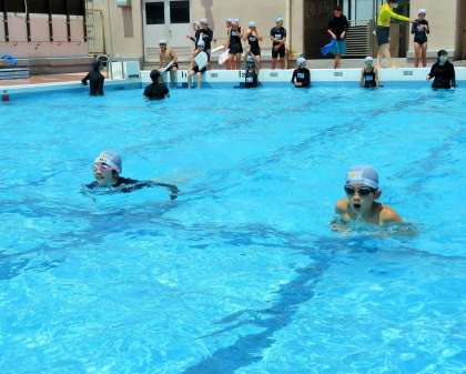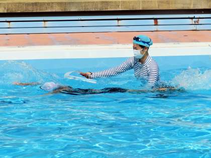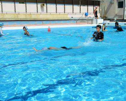多くの先生がプールに入っているので、グループごとにじっくり見てもらいながら検定試験ができます。