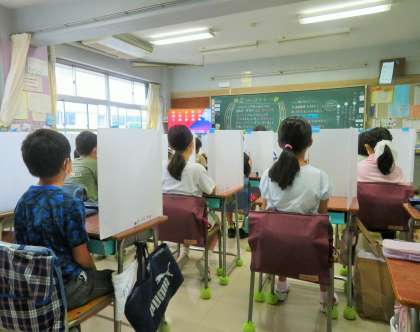 写真は、放送朝会を聞いている4年生の様子です。
